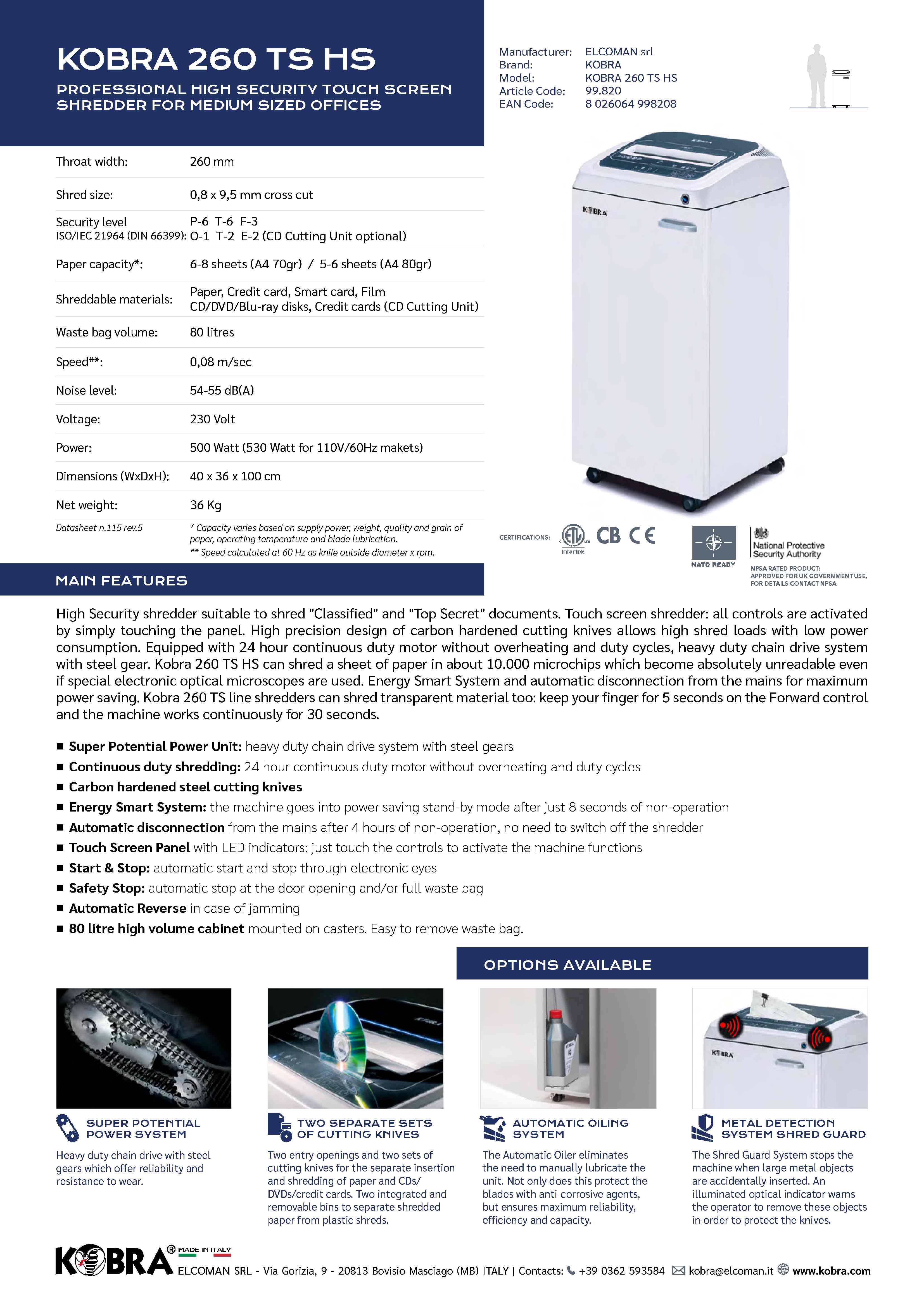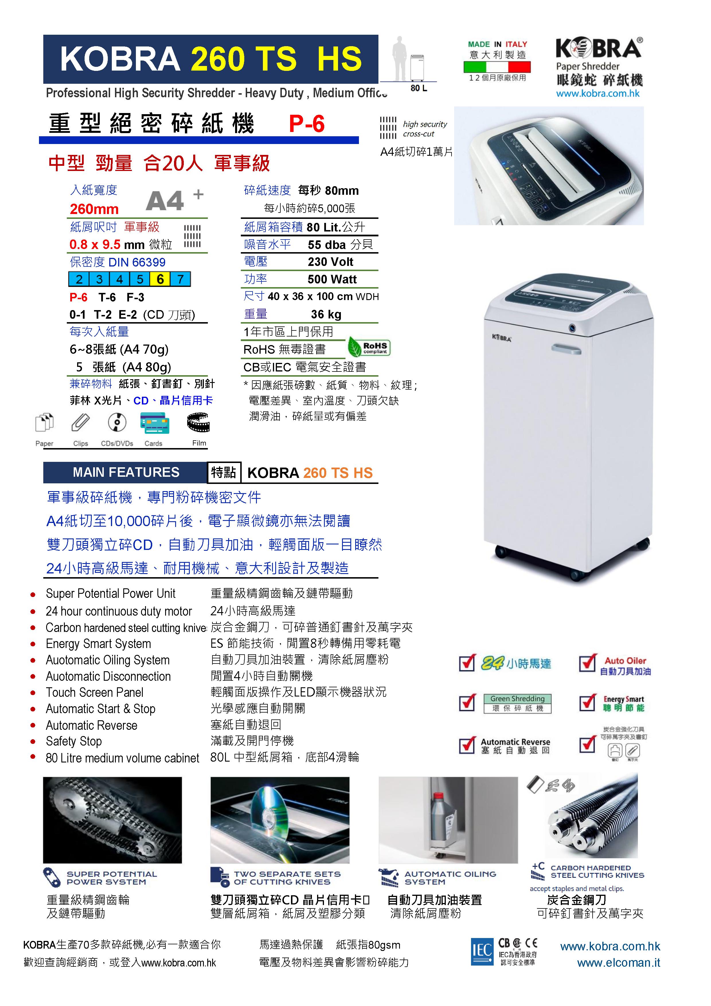 KOBRA 260TS HS中型碎紙機(0.8x9.5軍事級) CD雙刀頭